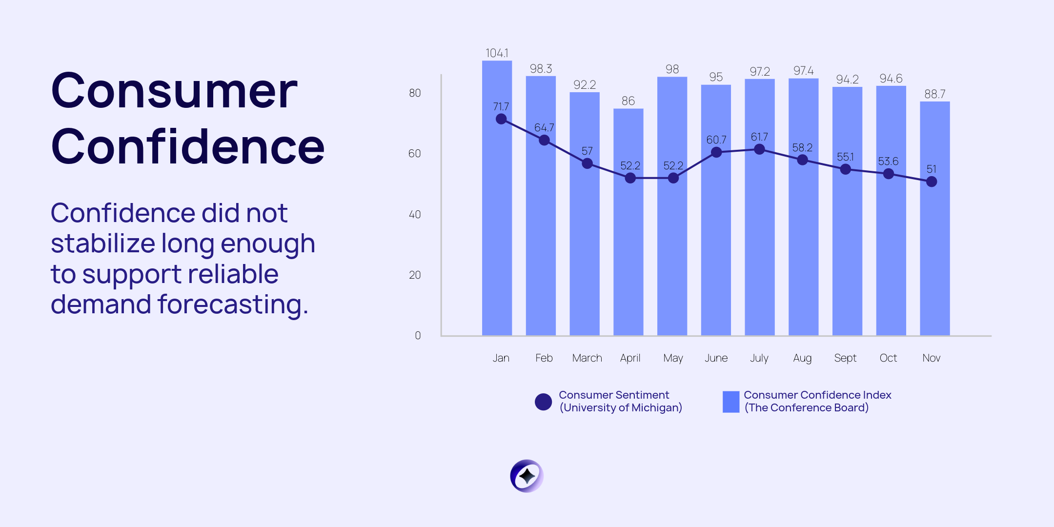 This chart matters because consumer confidence influences spending decisions, especially for discretionary purchases. The data shows that confidence did not stabilize long enough to support reliable demand forecasting. Even when confidence improved, it did not remain elevated.