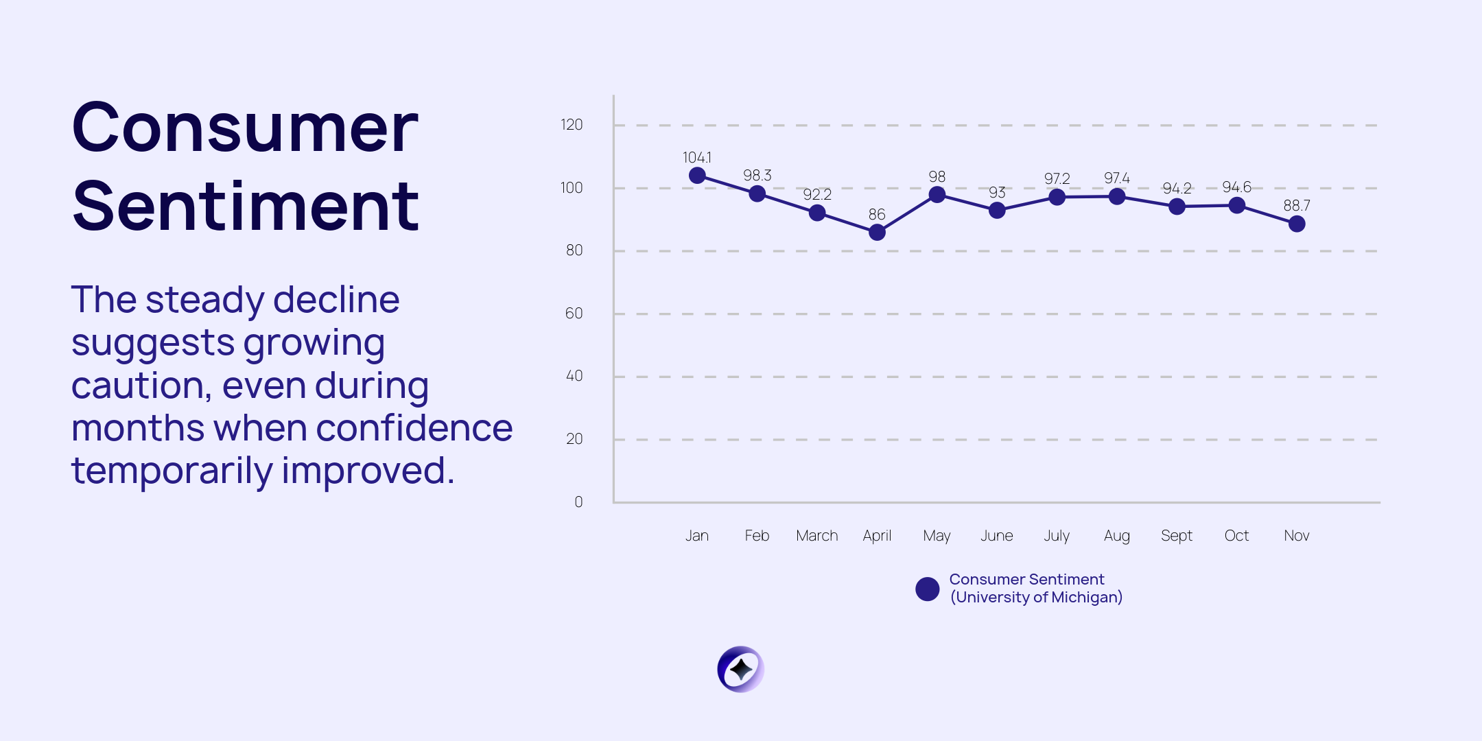 Sentiment is a forward-looking indicator. It reflects how consumers feel about their financial prospects and the broader economy. The steady decline suggests growing caution, even during months when confidence temporarily improved.