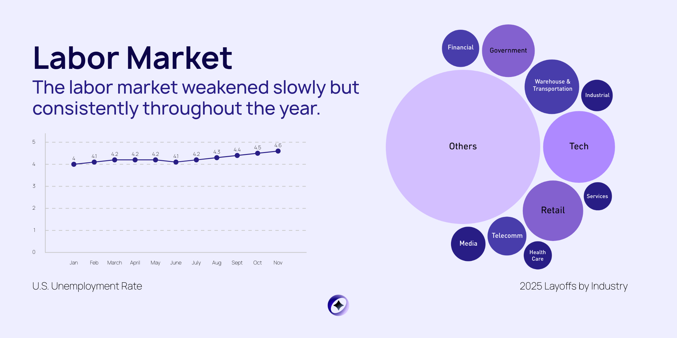 Rising unemployment often lags other indicators. By the time it shows up, demand softness has usually been present for months. This trend aligns with declining sentiment and helps explain why hiring plans changed and why revenue growth slowed in the second half of the year.