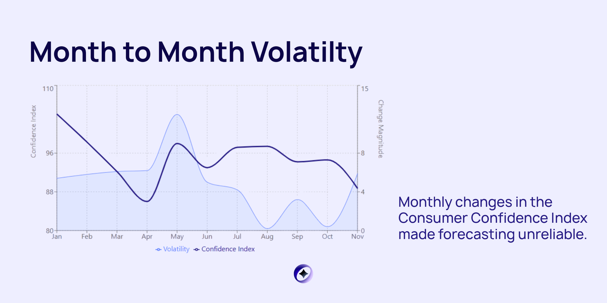 Monthly changes in the Consumer Confidence Index were large and frequent. February, March, and April each saw declines of more than five points. May jumped by 12 points. November fell by nearly six points.